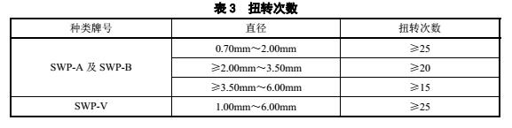 扭转特性直径 0.70mm~6.00mm 的钢丝,按 8.4 条进行扭转性试验,其扭转次数见表 3。此时,