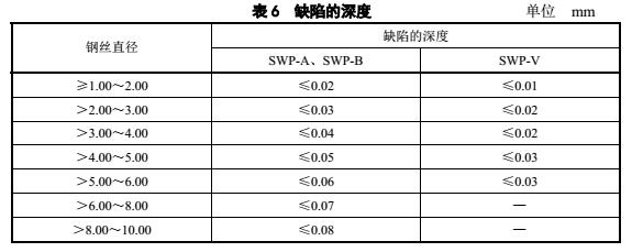 直径 1.00mm 以上钢丝的缺陷按 8.7 条进行检验,缺陷的深度见表 6。
