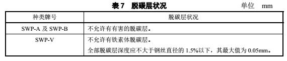 直径 0.70mm 以上钢丝的脱碳层按 8.8 条检验,脱碳层见表7。